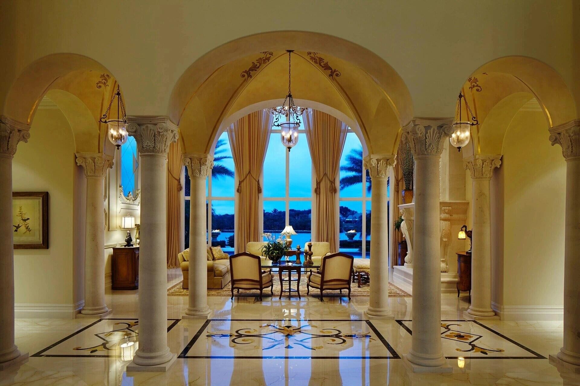 Main Element: Stone facade with carvings, marble flooring with waterjet medallion, stone column and moulding, solid wood cabinet and wall panel, metal railing, double-layer marble fireplace, wood parquet for bedroom